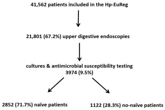 The European Registry on H. pylori Management (Hp-EuReg) is an international multicenter prospective non-interventional registry with a collection of information on H. pylori infection management since 2013, which was promoted by the European Helicobacter and Microbiota Study Group (www.helicobacter.org, accessed on 1 February 2021) [33,34].