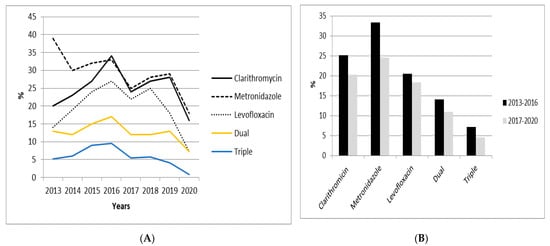 Evolution of Helicobacter pylori antibiotic resistance in naïve patients over the past eight years (A) and according to study periods: 2013–2016 and 2017–2020 (B).
