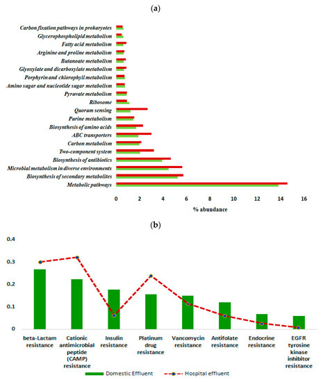 (a) Relative abundance (%) of different bacterial pathways detected in the wastewater samples (differences in the overall abundance of metabolic genes in the collected effluent samples were significant; p = 0.021). Red bar represented HWW samples and green bar represented DWW samples. (b) Various antibiotic resistance pathways identified in domestic and hospital effluent samples.