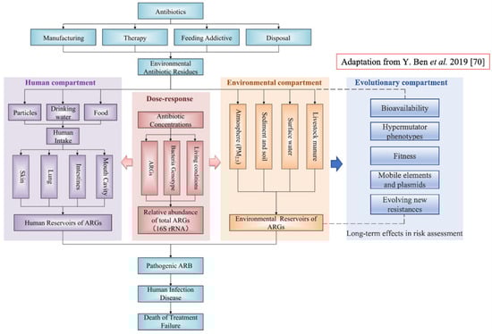 Conceptual framework of human health risk assessments of antibiotic resistance and the new component ‘Evolutionary compartment’ (on the right in blue). The evolutionary component has link-bridges with the ‘Environmental component’, and by extension it affects the ‘Human compartment’ leading to the fate of the entire system. The ‘Evolutionary component’ would introduce a specific portion of assessment regarding microorganisms’ evolution within a specific environment; this will provide assessment of long-term effects in ARB and ARGs selection and persistence (Figure revised from [70]).
