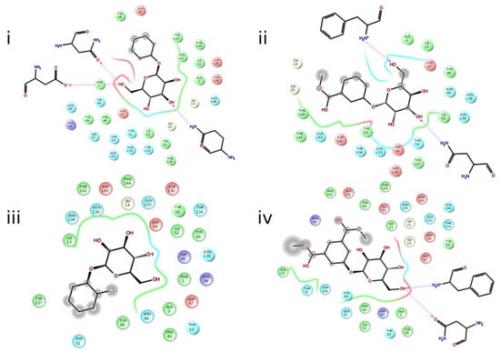 To choose the best out of the nine poses of the binder within the protein (Supplementary Materials Tables S1–S20), two criteria were considered: the lowest energy and the lowest root-mean-square deviation (RMSD) with respect to the native binder. These couplings provide a static view of the different interactions within the complex (protein–ligand) that contribute to the binding affinity. For example, in protein 4XO9, the residues of aspartic acid (ASP 54), asparagine (ASN 46), and glutamine (GLN 133) form hydrogen bonds with the hydroxyl groups of the mannopyranose of ligand b (Figure 1). In the same protein, ligand g has an interaction with the phenylalanine (PHE 1) and aspartic acid (ASP 135) residues. In the case of protein 4X5P, ligand j interacted with phenylalanine (PHE 1) and asparagine (ASN 46) so that the binding affinities of D-mannose inhibitors are exceptionally good []. All these interactions are important for the stabilization of the protein–ligand complex, with hydrogen bonds usually constituting one of the most important contributions to the total interaction energy in the absence of covalent ligand–receptor bonds.