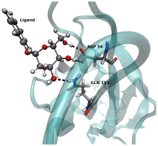 In addition to the contribution to the stability of the complex made by the ASP 54 hydrogen bond interaction, we also observed, for the strongest binders, an interaction between the ligand and GLN 133 (Table 7). A typical example of the hydrogen bond interactions observed between the ligands and the two residues is depicted in Figure 2. These residues are located near the surface-exposed loop close to the D-mannose binding pocket. Munera et al. [] show that this region plays a role in the adhesion of UPEC strains to the uroepithelium. The inhibitors tested showed strong binding to the active site of the proteins, due to the formation of hydrogen bonds, which in turn provide stability to the protein–ligand complexes tested [].