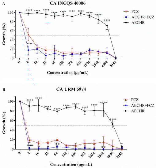 | STRAIN | AECHR IC50 (μg/mL) | FCZ IC50 (μg/mL) | AECHR* + FCZ IC50 (μg/mL) |