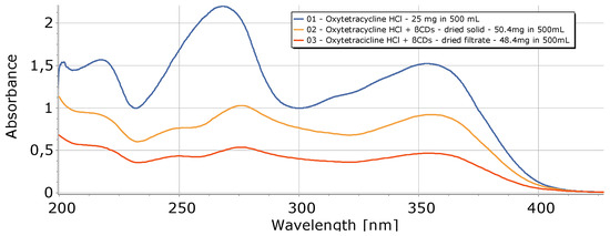 Complexation was performed with a 1:1 molar ratio of CDs (5.50 g) to oxytetracycline (1.92 g) in water. CDs were not dried before use and a 14 wt% (βCD) and 10 wt% (γCD) of water were considered. HCl 0.001 M was added to solubilize the cycline. The solution was then stirred for 12 h and filtered. Both RAMEB and γCD resulted in a homogeneous solution that was collected and freeze-dried to obtain a yellow crystalline solid. The βCD resulted in a precipitate that was collected after filtration and dried in a vacuum (3.10 g). The solution was freeze-dried, obtaining 4.32 g solid. UV-Vis analysis of the two solid fractions indicates a content of 30% w/w of oxytetracycline for the first solid and 25% w/w for the second one (Figure 1). The UV-Vis spectra were visualized via SpectraGryph 1.2 software.