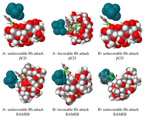 As shown in the energetics in Table 3, the two orientations of tetracycline rings are not equally possible in CD complexes. Both OXY-HCl and the dehydrated intermediate formed in βCD and RAMEB prefer B/C rings in the cavity. The inclusion of A/B rings in this orientation of tetracycline results in significantly lower energy states than C/D inclusion with βCD. The consequence of entrapped C/D rings is that the reducible moiety is not accessible to the hydrogenation catalyst. As the C/D rings move out of the CD cavities, they become virtually freely accessible to the rhodium nanoparticles, but the formation of both C6-epimers of DOXY is not equally possible, as shown in Figure 2. The primary hydroxyl groups are blocking the favorable hydrogenation position. Although both the OXY-HCL and the dehydrated intermediate favor the inclusion complex, in the case of RAMEB, the interaction is as strong as with βCD.