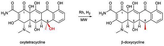 Many authors have opted for the use of homogeneous Rh(I) and Rh(III) catalysts instead, controlling the enantioselectivity of the reaction via the steric hindrance of the organic ligands [13,18]. The total synthesis of doxycycline, starting from simple building blocks, is also possible, but generally involves several steps that lower the yield. One example is the enantioselective synthesis reported by Charest et al., which indeed led to the α form of doxycycline, but in 18 steps with a yield of 8.3% [19].