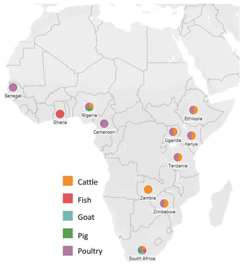 Data in Table 1 was collated from several research papers over the last ten years (2011–2021), which includes the country of research, livestock species focused on, and the sample analyzed for presence of bacteria as well as the antibiotic resistance pattern obtained from bacteria isolated. Using the data from the table above, Figure 1 below was tabulated to represent the species of livestock farmed in SSA. Additionally, poultry appears to be a popular livestock species that is commonly farmed (Figure 1) in most SSA countries but also records to be a source of high antibiotic resistance, with some African countries reporting resistance to more than ten antibiotics, as depicted in Table 1.