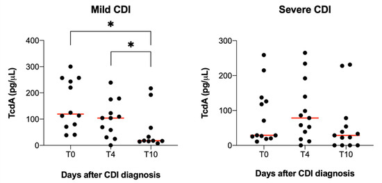 | TcdA (pg/µL ± SD) | 92.28 ± 96.08 | 83.75 ± 74.81 | 49.96 ± 70.96 |