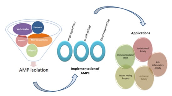 Similar to AMPs, a group of polymers exists, known as synthetic antimicrobial oligomers, which are cationic and amphiphilic in nature [32]. These antimicrobial agents are fabricated to imitate AMPs [33]. However, these oligomers have a drawback of heterogeneity and innate toxicity [34]. Thus, antimicrobial peptides have the advantage of low toxicity over the synthetic antimicrobial oligomers and are highly effective in microbial disruption [35]. Recent studies have shown the impactful results of using AMPs in the biomedical sector. This article is different from various other papers on AMPs because it not only includes information about the factors affecting the functioning of AMPs and their important role, but along with it, focuses on the implementation techniques of AMPs in the biomedical sector. In this review, smart and intelligent delivery methods are also considered. Thus, this review could be helpful for readers that require compact information about the role of AMPs in biomedical applications. The schematic representation of this review is shown in Figure 1.