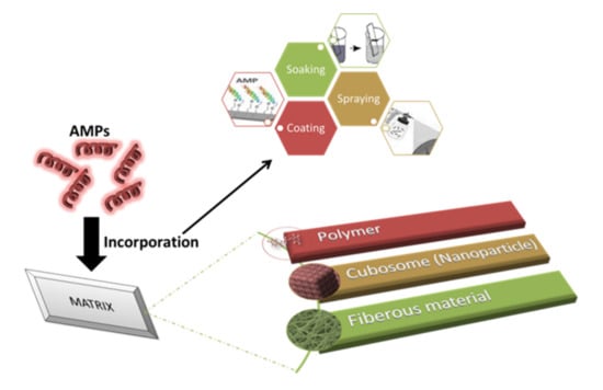 Figure 2. Impregnation of AMPs into compatible matrices. Incorporation of AMPs in a matrix is usually performed via soaking, coating, or spraying. The three common matrices are polymer, cubosome, and fibrous material.
