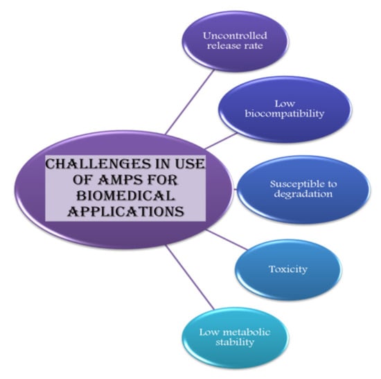 Other than the uncontrolled release rate, factors such as low biocompatibility, low metabolic stability, low solubility, high susceptibility to degradation, and toxicity act as a hurdle in applications of AMPs (Figure 4) [213].