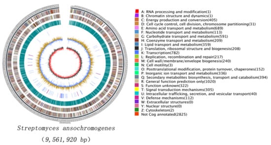 In order to obtain a complete genome sequence of S. ansochromogenes 7100, the third generation sequencing was performed on a PacBio RSII platform. A total of 157,549 quality subreads were obtained in genome sequencing with an approximate coverage fold of more than 100× (Table S1, Supplementary Materials).