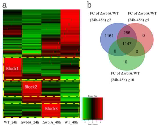 Heatmap and Venn diagram of gene transcriptional profiles. (a) Heatmap represents all differentially expressed genes whose transcriptional change ≥ 2–fold at 24 h and 48 h in both WT and ΔwblA strains, respectively. padjust < 0.001. Red and green colors represent up-regulated and down-regulated genes, respectively. (b) The Venn diagram represents the numbers of differentially expressed genes in ΔwblA compared with those of WT (fold change ≥ 2-fold, ≥5-fold and ≥10-fold) at both 24 h and 48 h, which was created using DESeq package, a software platform for identifying differentially expressed genes from RNA-seq data. FC indicates fold change.