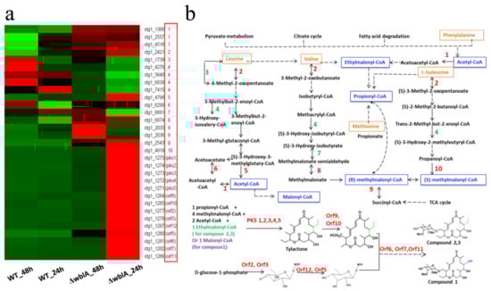 Differentially expressed genes in tylosin analogue compounds (TACs) biosynthesis in WT and ΔwblA. (a) Analysis of significantly expressed genes in both WT and ΔwblA at 24 h and 48 h. |log2FC| ≥ 1 and padjust < 0.001. Expression variance for each gene was indicated by different colors: red (up-regulated genes), green (down-regulated genes) and black (|log2FC| < 1). The numbers or gene names in the red box are corresponding to the catalytic reaction steps involved in (b). (b) Proposed pathway diagram of TACs biosynthesis and the relevant amino acids catabolism. The blue boxes represent the precursors that incorporated into tylactone, and the orange boxes represent the precursors derived from the catabolism of five amino acids. The numbers 1–10 denote differentially expressed genes in 10 reaction steps of deduced KEGG pathway. Green numbers denote down-regulated genes encoding enzymes responsible for these reaction steps, red numbers denote up-regulated genes encoding enzymes responsible for these reaction steps. Dotted arrows represent multiple genes responsible for these reaction steps.