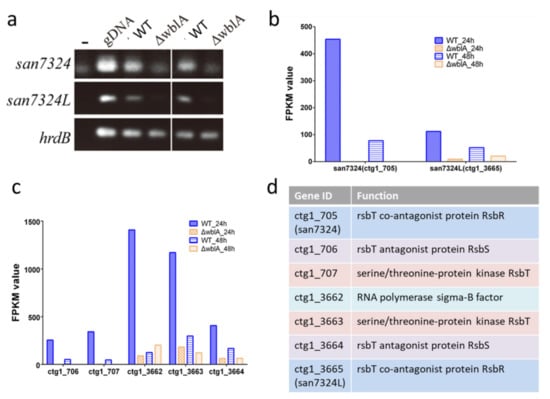 In ΔwblA, transcription of an rsbR homologous gene ctg1_705 (named as san7324) in RNA-seq data was found to be dramatically decreased, which was consistent with the RT-PCR results (Figure 4a,b), implying that it was positively regulated by WblA. RsbR encoded by rsbR is a positive regulator modulating sigma factor B activity in Bacillus subtilis [,,]. The disruption of san7324 in S. ansochromogenes 7100 abolished nikkomycin production (Figure S3). However, unlike that in ΔwblA, the production of tylosin analogues in Δsan7324 was not detected []. One hypothesis is that a san7324 homologous gene ctg1_3665 (named as san7324L), which was almost not transcribed in ΔwblA, might play the same function, while san7324 was deficient. In addition, their flanking genes (encoding RsbS, RsbT or sigma factor) also showed low transcriptional levels (Figure 4c,d).