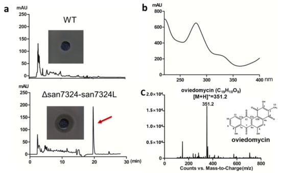 Thus, the double mutation of san7324 and san7324L (Δsan7324/7324L) was constructed and the HPLC results showed TACs were still not be observed. To our surprise, a new peak with maximum absorbance at 280 nm was detected. This compound exhibited an obvious inhibition zone against Bacillus subtilis (Figure 5a,b). Mass spectrometry (MS) analysis showed a [M + H]+ signal at m/z 351.2, which is consistent with oviedomycin (Figure 5c). Oviedomycin is an anthracycline antibiotic which had been previously activated in ΔadpA []. The production of oviedomycin implied that RsbR homologs might negatively regulate oviedomycin biosynthesis.