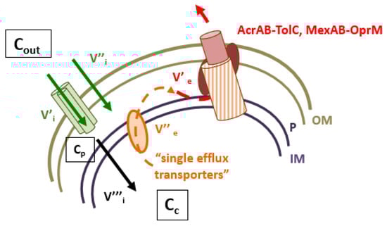 Intracellular concentration of antibiotics and RND efflux pumps. V’i and V’’i represent the influx rate across the outer membrane, V’’’i represents the diffusion rate across the inner membrane. Cout, Cp and Cc represent the external, periplasmic and cytoplasmic concentration of antibiotics, respectively. V’’e and V’e represent the efflux rate accross the inner and outer membranes. AcrAB-TolC and MexAB-OprM illustrate the archetype of efflux pumps detected in clinical isolates.