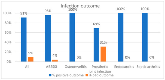 A total of 50 patients (91%) achieved a successful clinical outcome with dalbavancin, seen as improvement or disappearance of signs and symptoms of infection and discharge from hospital (Figure 1). These included 96% of the patients with ABSSSI, 69% of the patients with prosthetic joint infections and 100% of cases of osteomyelitis, endocarditis and septic arthritis.