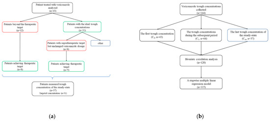 The flow charts show (a) changes of voriconazole trough concentrations in 43 patients during treatment clinically; (b) statistical analysis of 144 measured voriconazole trough concentrations.