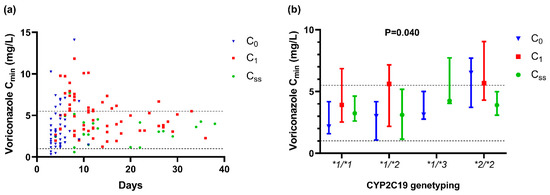 Distinction of voriconazole trough concentration of 43 patients (a) as the therapeutic progress by days (n = 144); (b) in different CYP2C19 phenotype groups (n = 103, p = 0.040). The Kruskal–Wallis test was used to compare Cmins of the four groups. Data are expressed as the median ± interquartile range. Cmin, voriconazole trough concentration; CYP2C19, cytochrome P450 2C19; C0, the first trough concentration after voriconazole therapy; Css, the final trough concentration; C1, the repeated measured trough concentration except Css. *1, *2, *3, *17 reprented the single nucleotide sequence of genotype of CYP2C19.
