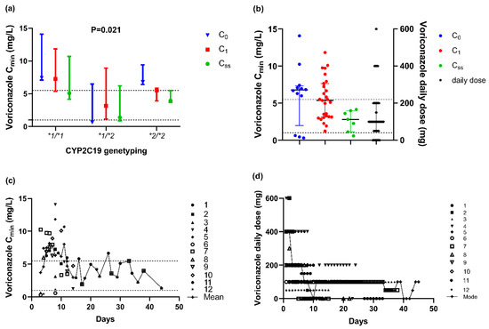 For 12 patients started beyond the therapeutic target (a) Distinction of voriconazole trough concentration in different CYP2C19 phenotype groups (n = 50, p = 0.021). The Kruskal–Wallis test was used to compare Cmins. (b) Distinction of voriconazole trough concentration in different groups of C0, C1, Css (n = 50), and daily dose (n = 27). Data are expressed as the median ± interquartile range. (c) The mean concentration of such 12 patients changed by days. (d) Every dosage adjustment (n = 247) and the mode dose (n = 45) by days (It showed the highest one if there were more than one mode). *1, *2, *3, *17 reprented the single nucleotide sequence of genotype of CYP2C19.