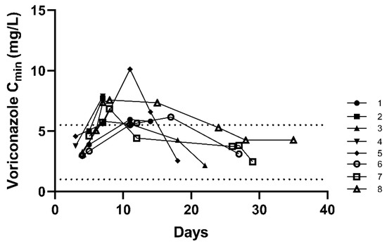 The voriconazole trough concentrations by days of 8 patients who had targeted C0 but supratherapeutic C1 during the constant unchanged therapy dosage of voriconazole (n = 38).