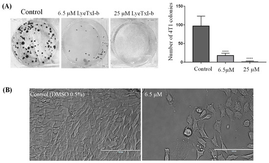 The 4T1 cells were maintained in DMEM medium supplemented with 10% FSB for 24 h in 5% CO2. After the cell’s trypsinization process, they were resuspended in sufficient media volume to neutralize the trypsin enzyme. Additionally, 4T1 cells were quantified, and 300 cells were immediately re-plated in six-well tissue culture plates for 24 h. Then, the cells were treated with 6.5 µM (IC50) and 25 µM (IC80) of LyeTxI-b for 12 h. After the incubation period, the medium was removed, the cells were carefully rinsed with PBS, fresh culture medium was added, and the cells kept growing for 10 days. Plates were fixed with ethanol 70% for 40 min and stained with 0.5% crystal violet for 15 min. The ethanol and crystal violet mixtures were carefully removed, and the plates were rinsed with tap water [42]. The fraction of plating efficiency surviving was calculated.