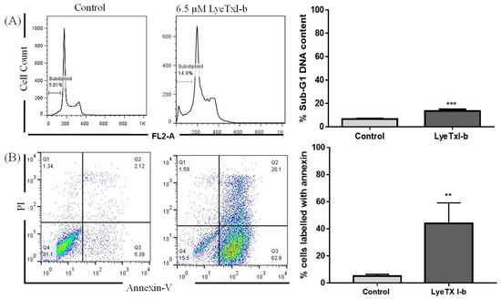 Apoptosis evasion is one of the most important hallmarks of cancer. As more apoptosis-inducing anticancer drugs are discovered, the most effective treatment could emerge. In this context, the sub-diploid DNA content was determined to evaluate the in vitro potential of the peptide LyeTx I-b to induce apoptosis in 4T1 cells. Cells undergoing apoptotic cell death display an increase in sub-diploid DNA content that can be correlated with DNA fragmentation and phosphatidylserine exposure. Both cell alterations were measured by flow cytometry after 48 h treatment of 4T1 cells with LyeTxI-b at the IC50 concentration. A significant increase in the sub-diploid (sub-G1) DNA content was observed in the LyeTxI-b -treated cells (Figure 2A) compared to the control (PBS), suggesting induction of apoptosis or necrosis. To distinguish between apoptosis and necrosis, the evaluation of phosphatidylserine exposure, an early event of apoptosis associated with the phosphatidylserine translocation from the internal to the external leaf of membrane, was investigated by labeling cells with annexin-V and propidium iodide (PI). The 4T1 cells were treated with 6.5 µM of LyeTxI-b for 24 h and stained with annexin V/PI for 15 min. The flow cytometry data (Figure 2B) demonstrated that the majority of the 4T1 population was distributed or located in the areas of annexin positive (i.e., quadrant Q3 represents the early apoptotic area and the minor population was double-positive (PI positive/annexin V positive), representing late apoptosis or necroptosis in the Q2 area). By contrast, all control cells were located in the double negative Q4 area of live cells (PI negative/annexin V-negative).