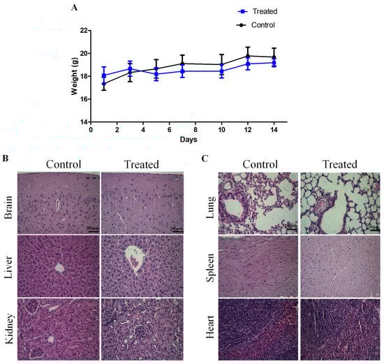 In order to investigate the in vivo sub-acute toxicity of LyeTxI-b, female BALB/c mice received intraperitoneal (i.p.) injection of the peptide (5 mg/kg) (seven doses, 48 h apart). Clinical signs, such as toxicity, skin ulcer, diarrhea, and mortality, were not observed over the period assessed. Body weight of animals treated with saline (control group) or LyeTx I-b dissolved in saline (5 mg/kg) was evaluated over 14 days. No difference was observed in body weight between the control and treated animal groups throughout the evaluation period (Figure 3A). Histopathological and macroscopic analysis (lung, kidney, spleen, heart, brain, and liver) demonstrated that LyeTxI-b did not cause lesions or significant alterations in these organs (Figure 3B,C). In the area of the Bowman’s capsule, glomerulus and tubules from the renal cortex showed normal patterns compared to control. The liver components i.e., parenchyma, hepatocytes, central vein, bile duct morphology displayed normal patterns (Figure 3B). The lung histopathology was also preserved, without changes in alveoli, alveolar air spaces (Figure 3C). The analysis of spleen revealed well preserved white pulp, red pulp, central artery, and capsule. Moreover, the heart muscle fiber, intercalated disc, and nuclei morphology were normal as well (Figure 3C).