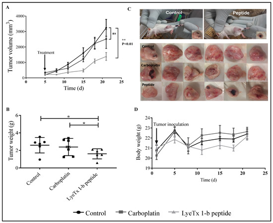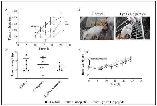 On day 10 post-tumor inoculation, when the tumor volume reached approximately 1000 mm3, animals received intratumoral injections of 100 µL of LyeTx I-b or carboplatin (5 mg/kg) dissolved in saline. At the end of the experiments, internal tumor burden was necropsied, and the enlargement of spleens and lymphnodes was notably observed in the vehicle control (data not shown). Figure 4A shows that LyeTxI-b significantly reduced tumor volume compared to the control group. Representative images of animals of the control group and treated with LyeTx I-b or carboplatin are presented in Figure 4B. No differences in tumor weight or body weight of animals were observed in both groups (peptide or carboplatin) compared to the control (Figure 4C,D, respectively).