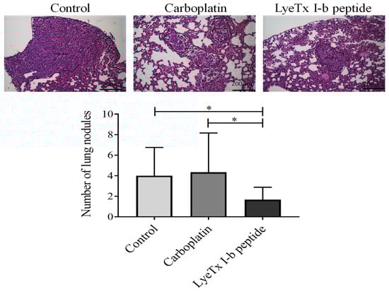 The assessment of lung metastasis shows that LyeTx I-b significantly reduced the number of metastatic focus in animals in comparison to carboplatin and control groups (Figure 6). The mean number of metastases for the peptide-treated group was 1.66, 4.33 for carboplatin, and 3.66 for the control group. Moreover, LyeTx I-b reduced the lesion areas (Figure 6).