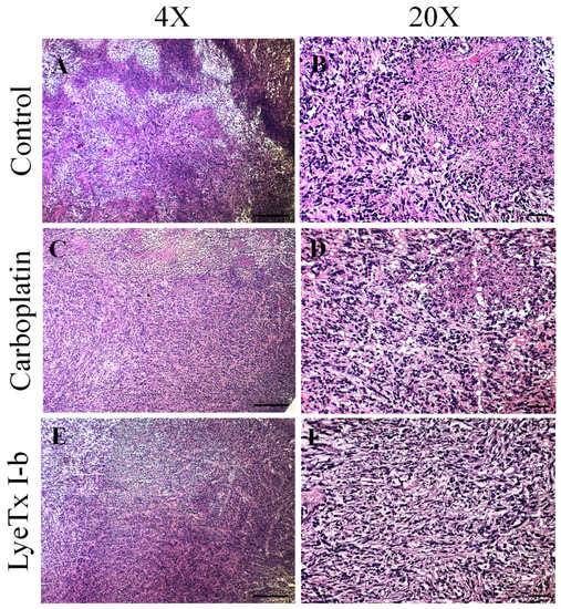 Histological effects of subcutaneous administration of LyeTx I-b on4T1 murine primary tumor, n = 6. (A,B) The control group exhibited the presence of neoplastic cells with a high degree of cellular polymorphism. (C,D) The carboplatin group showed inflammatory infiltrate characterized by mononuclear and neoplastic cells with a high degree of polymorphisms. (E,F) The reduction of areas of necrosis and fibrosis in the tumor periphery. (B,F) The group treated with LyeTx I-b presented a reduction in neoplastic cells and necrotic areas, associated with increased deposition of fibrous connective tissue. H&E staining. Objectives: 4× and 20×. Scale bars: 200 µm and 40 µm.