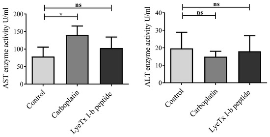 We further tested whether LyeTx I-b (5 mg/kg) could alter liver functions in 4T1 tumor-bearing animals. There were no alterations in the level of serum alanine aminotransferase (ALT) in all groups. However, the serum aspartate transaminase (AST) level was significantly elevated in the carboplatin (5 mg/kg) group but not in the LyeTx I-b-treated group (Figure 9). Therefore, our data suggest that LyeTx I-b treatment was not significantly different from the control and did not induce hepatotoxicity, similar to carboplatin, in the 4T1 murine mammary carcinoma.