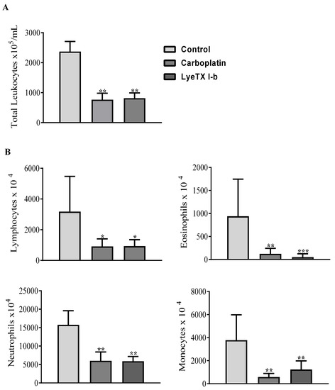 Leukogram of peripheral blood counts in 4T1 tumor-bearing mice. The control received saline, and the other groups received carboplatin or LyeTx I-b (5 mg/kg), five doses every 72 h. (A) Total leukocytes count × 105. (B) Differential leukocytes count × 104, lymphocytes, eosinophils, neutrophils, and monocytes. LyeTx I-b and carboplatin induced leukopenia in treated groups. Data are presented as the mean ± SD, * p < 0.05; ** p < 0.01; *** p < 0.001 compared to the control group, n = 6 animals.