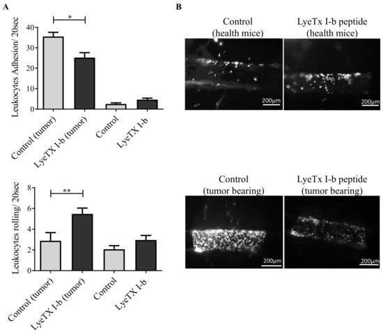 Evaluation of in vivo leukocyte recruitment by intravital microscopy, on day22 post-inoculation of 4T1 tumor cells. (A) Number of rolling and adhering leukocytes in health and tumor-bearing mice. Both control groups received 100 µL of saline, and treated groups received 5 mg/kg of LyeTx I-b dissolved in saline subcutaneously (5 doses/72 h apart). (B) Representative images of blood vessels of the spinal cord show the impact of LyeTx I-b treatment on leukocyte-endothelial interactions; higher numbers of adherent leukocytes in tumor-bearing control compared to the treated group were observed. Statistical analysis: Data are presented as the mean ± SD, * p < 0.05; ** p < 0.01, n = 6 animals. One-way ANOVA followed by Tukey’s multiple comparisons test.