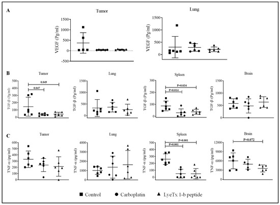Cytokines levels in the tumor LyeTx I-b attenuated VEGF, TGF-β, and TNF-α levels in the tumor microenvironment. Individual values of mice (pg/mL) are presented in a dot plot with an average of each group, n = 6. (A) Data correspond to VEGF differences found in primary tumor and lung. (B,C) TGF-β and TNF-α values in the primary tumor, brain, spleen, and lung. Statistical variation among groups was carried out in 6 animals of each group in duplicate using One-way ANOVA, p < 0.05.