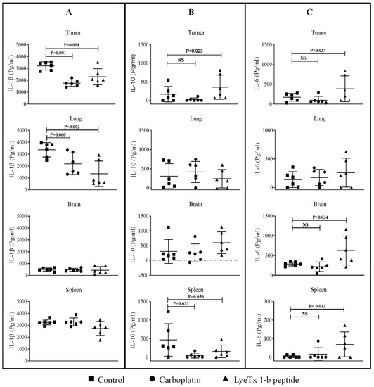 LyeTx I-b changed levels of IL-1β, IL-6, and IL-10 expression in the tumor microenvironment. Individual values of mice (pg/mL) are presented in a dot plot with an average of each group, n = 6. (A) Data correspond to IL-1β found in the primary tumor, brain, spleen, and lung. (B,C) IL-10 and IL-6 levels, respectively. Statistical variation among groups was carried out in 6 animals of each group in duplicate using One-way ANOVA, p < 0.05. NS means not statistically significant.