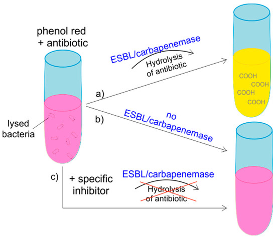 Principle of colorimetric assays for detection of ESBLs and carbapenemases. The test isolate is lysed and incubated in phenol red solution with an antibiotic. (a) If the test isolate is positive for ESBL/carbapenemase production, the enzyme hydrolyzes the antibiotic, resulting in a pH shift and a color change from magenta to yellow. (b) ESBL/carbapenemase-negative isolates do not induce a change in color. (c) Addition of enzyme-specific inhibitors prevents hydrolysis of the antibiotic, and no color change is visible.
