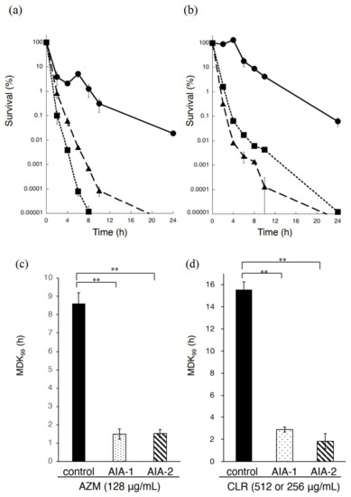 Time-kill assay for PAO1. (a) Time-kill assay for PAO1 in the presence of azithromycin at 256 μg/mL with or without AIA-1 and -2 at 32 μg/mL. Azithromycin alone, filled circle on the solid line; azithromycin with AIA-1, a filled square on the dotted line; azithromycin with AIA-2, filled triangle on the dashed line. (b) Time-kill assay for PAO1 in the presence of clarithromycin at 512 or 256 μg/mL with or without AIA-1 or -2 at 32 μg/mL. Clarithromycin alone, a filled circle on the solid line; clarithromycin with AIA-1, filled square on the dotted line; clarithromycin with AIA-2, filled triangle on the dashed line. MDK99 was determined by measuring the time to kill 99% of the population with azithromycin at 256 μg/mL with or without AIA-1 and -2 at 32 μg/mL (c) and clarithromycin at 512 or 256 μg/mL with or without AIA-1 and -2 at 32 μg/mL (d). Assuming that survival at time 0 was 100%, CFU values were converted to percentages. All experiments were performed in triplicate. ** p < 0.01, (Student’s t-test). Error bars, SDs for three experiments.