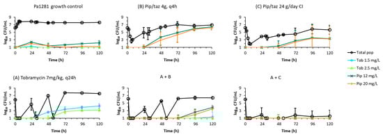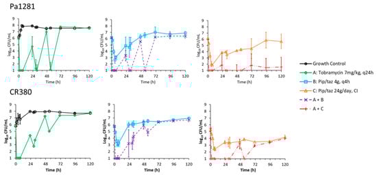 All monotherapies failed in the dynamic IVM, where neither of the antibiotics provided complete suppression of regrowth. Tobramycin monotherapy (7 mg/kg once daily) failed against both isolates, with regrowth of the total bacterial population to control levels by 72 h and less-susceptible subpopulations evident from 48–72 h onwards (Figure 1, Figure 2 and Figure 3). A greater extent of killing after dosing at 24 and 48 h was observed against Pa1281 (up to ~5 log10 killing) compared to CR380 (up to ~2.2 log10 killing). Against Pa1281, both the intermittent (4 g every 4 h) and continuous infusion (24 g per day) dosing regimens of piperacillin-tazobactam provided initial killing of up to ~4 log10 CFU/mL. This was followed by regrowth of the total population to 6.9 and 5.7 log10 CFU/mL by 120 h for the intermittent and continuous infusion, respectively, corresponding to bacterial densities approximately 1 and 2 log10 below the growth control. Less-susceptible subpopulations were observed from 48 h. A more pronounced difference in regrowth between the two piperacillin-tazobactam regimens was observed for CR380, where the continuous infusion was able to suppress growth of the total population to below ~4 log10 CFU/mL throughout, while regrowth to ~7 log10 CFU/mL by 120 h occurred with the intermittent infusion regimen. Subpopulations less susceptible to piperacillin were not observed for isolate CR380.