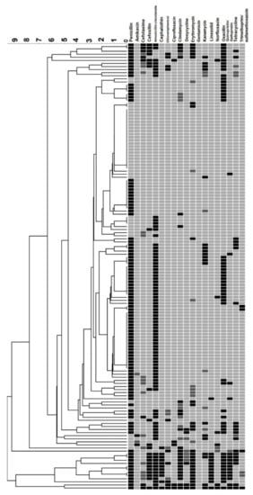 The antibiotic susceptibility testing result of S. aureus was summarized in Table 2. In the current study, 80.0% (124/155) of S. aureus isolates showed resistance against one or more antibiotics. The findings also revealed that S. aureus showed the highest resistance rate towards penicillin (72.3%, 112/155; 95% CI: 65.2–79.4%) and amoxicillin (53.5%, 83/155; 95% CI: 45.7–61.3%). Meanwhile, MRSA isolates showed the highest resistance rate against penicillin (100%; 6/6), cefoxitin (100%; 6/6), amoxicillin (83.3%, 5/6; 95% CI: 53.5–100%) and chloramphenicol (50.0%, 3/6; 95% CI: 10.0–90.0%). Gentamicin and linezolid were fully effective (100% susceptible) against all the isolated S. aureus from animal handlers. In addition, no significant differences were observed when comparing the antibiotic resistance profile of the S. aureus according to categories of animal handlers (veterinarian, pet owner and animal farmer). However, individuals with constant contact with poultry (7/22; 31.8%) were more likely to carry S. aureus that showed resistance against tetracycline as compared to ruminants (8/77; 10.4%) and pet animals (3/20; 15.0%). Similarly, S. aureus from animal handlers with constant contact with poultry (11/22; 50%) showed a higher resistance rate against erythromycin as compared to ruminants (4/77; 5.2%) and pet animals (6/17; 35.3%) handlers. Meanwhile, individuals with constant exposure to ruminant animals (34/77; 44.2%) were less likely to carry S. aureus resistant to penicillin compared to poultry handlers (19/22; 86.4%), pet owners (18/20; 90.0%) and aquatic animal handlers (6/9; 66.7%). In the present study, 19.4% (30/155; 95% CI: 13.2–25.6%) of S. aureus isolates were categorised as multidrug resistant as they showed resistance to antibiotics from three different groups of antibiotics. The MDRSA prevalence rates of veterinarians, pet owners and animal farmers were summarized in Table 1. No significant difference was observed when comparing the carriage rate of MDRSA according to sample groups (veterinarian, pet owner and animal farmer). Multiple antimicrobial resistance index (MARI) assessment (Table 3) revealed that 26 (16.8%; CI: 10.9–22.7%) out of 155 S. aureus isolates have an MARI value of 0.2 and above. The relatedness of the S. aureus isolates based on their phenotypic antibiotic resistance pattern were displayed in the dendrogram (Figure 1) generated using the unweighted pair group method with arithmetic mean (UPGMA), showing that two major clusters can be formed among the isolates.
