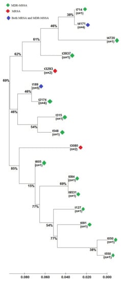 Thirty of the multidrug-resistant S. aureus (MDRSA) isolates (5 MRSA and 25 MDR-MSSA) were characterized using spa typing (Figure 2). Seventeen different spa types were identified, with the most prominent spa types identified being t189 (16.6%; 5/31) and t4171 (16.6%; 5/31). Other spa types included t2174 (12.9%; 4/31), t3080 (6.5%; 2/31), t3293 (6.5%; 2/31), t050 (3.2; 1/31), t550 (6.5%; 1/31), t084 (3.2; 1/31), t091 (3.2; 1/31), t127 (3.2; 1/31), t315 (3.2; 1/31), t548 (3.2; 1/31), t605 (3.2; 1/31), t714 (3.2; 1/31), t3937 (3.2; 1/31), t4720 (3.2; 1/31) and t9531 (3.2; 1/31). Among the MRSA group, four different spa types were identified, including t189 (n = 2), t3293 (n = 2), t4171 (n = 1), and t3080 (n = 1). Based on Figure 2 it was observed that the MDRSA isolates can be divided into three major clusters where t714, t4171, t4720, t3937 and t3293 belong to cluster 1. The spa types t189, t2174, t315 and t548 were grouped into cluster 2, while t3080, t605, t084, t9531, t127, t091, t050 and t550 were categorized into cluster 3. The genotypic profiles of MRSA and MDR-MSSA from animal handlers in Peninsular Malaysia were shown in Table S1. Based on the findings, it was observed that genotypic profiles of the MDRSA were different, with the exception of MRSA 3 and MRSA 4.
