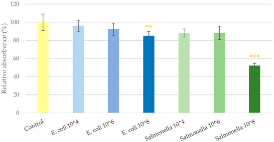 Viability of IPEC-J2 cells after one hour of treatment with bacterial suspensions. Control—treatment with plain medium; E. coli 10^4, 10^6, 10^8—treatment with 104, 106 or 108 CFU/mL E. coli, respectively; S. Typhimurium 10^4, 10^6, 10^8—treatment with 104, 106 or 108 CFU/mL S. Typhimurium, respectively. Data are shown as means with standard deviation and expressed as relative absorbance, considering the mean value of control as 100%. N = 6/group. Significant difference: ** p < 0.01, *** p < 0.001, in yellow: compared to the untreated control.
