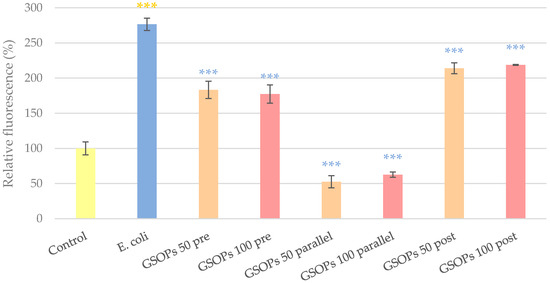 Intracellular reactive oxygen species level of IPEC-J2 cells after one hour of treatment with Escherichia coli and grape seed oligomeric proanthocyanidins (GSOPs). Control—treatment with plain medium; E. coli—treatment with 106 CFU/mL E. coli; GSOPs 50, 100 pre—pre-treatment before E. coli infection with 50 and 100 μg/mL GSOPs, respectively; GSOPs 50, 100 parallel—parallel treatment of E. coli infection with 50 and 100 μg/mL GSOPs, respectively; GSOPs 50, 100 post—treatment after E. coli infection with 50 and 100 μg/mL GSOPs, respectively. Data are shown as means with standard deviation and expressed as relative fluorescence, considering the mean value of control as 100%. N = 6/group. Significant difference: *** p < 0.001, in yellow: compared to the untreated control, in blue: compared to E. coli treatment.