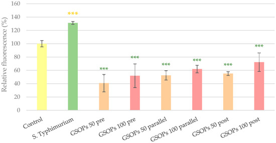 Intracellular reactive oxygen species level of IPEC-J2 cells after one hour of treatment with Salmonella Typhimurium and grape seed oligomeric proanthocyanidins (GSOPs). Control—treatment with plain medium; S. Typhimurium—treatment with 106 CFU/mL S. Typhimurium; GSOPs 50, 100 pre—pre-treatment before S. Typhimurium infection with 50 and 100 μg/mL GSOPs, respectively; GSOPs 50, 100 parallel—parallel treatment of S. Typhimurium infection with 50 and 100 μg/mL GSOPs, respectively; GSOPs 50, 100 post—treatment after S. Typhimurium infection with 50 and 100 μg/mL GSOPs, respectively. Data are shown as means with standard deviation and expressed as relative fluorescence, considering the mean value of control as 100%. N = 6/group. Significant difference: *** p < 0.001, in yellow: compared to the untreated control, in green: compared to S. Typhimurium treatment.