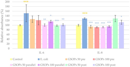 For the evaluation of anti-inflammatory properties of GSOPs, interleukin-6 (IL-6) and interleukin-8 (IL-8) levels of IPEC-J2 cells were measured. Treatment with E. coli significantly elevated levels of both IL-6 and IL-8 in the cells. In the case of IL-6, parallel and post-treatments with GSOPs (50 and 100 μg/mL) were able to decrease production of the inflammatory mediator; however, for IL-8, GSOPs pre-treatments also resulted in a significant alleviation of the effect of E. coli. Results are demonstrated in Figure 4.