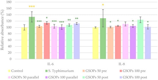 Similar to the effect of E. coli, S. Typhimurium caused a significant increase in the levels of the investigated cytokines (IL-6 and IL-8). All types and concentrations of GSOP treatments could decrease IL-6 levels, while in the case of IL-8, GSOPs at a 50 μg/mL concentration were not effective when applied before or after bacterial infection. The results can be seen in Figure 5.