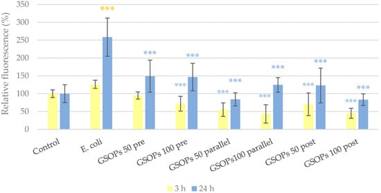 Paracellular permeability of IPEC-J2 cells 3 and 24 h after one hour of treatment with Escherichia coli and grape seed oligomeric proanthocyanidins (GSOPs). Control—treatment with plain medium; E. coli—treatment with 106 CFU/mL E. coli; GSOPs 50, 100 pre—pre-treatment before E. coli infection with 50 and 100 μg/mL GSOPs, respectively; GSOPs 50, 100 parallel—parallel treatment of E. coli infection with 50 and 100 μg/mL GSOPs, respectively; GSOPs 50, 100 post—treatment after E. coli infection with 50 and 100 μg/mL GSOPs, respectively. Data are shown as means with standard deviation and expressed as relative fluorescence, considering the mean value of control as 100%. N = 6/group. Significant difference: *** p < 0.001, in yellow: compared to the untreated control, in blue: compared to E. coli treatment.