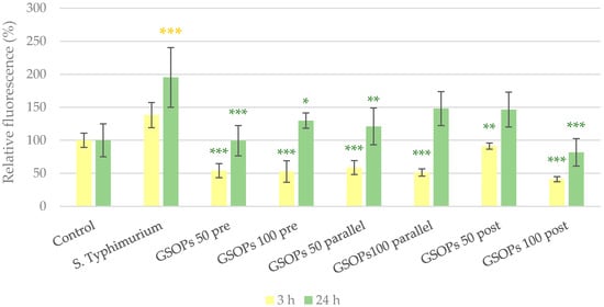 Paracellular permeability of IPEC-J2 cells 3 and 24 h after one hour of treatment with Salmonella Typhimurium and grape seed oligomeric proanthocyanidins (GSOPs). Control —treatment with plain medium; S. Typhimurium—treatment with 106 CFU/mL S. Typhimurium; GSOPs 50, 100 pre—pre-treatment before S. Typhimurium infection with 50 and 100 μg/mL GSOPs, respectively; GSOPs 50, 100 parallel—parallel treatment of S. Typhimurium infection with 50 and 100 μg/mL GSOPs, respectively; GSOPs 50, 100 post—treatment after S. Typhimurium infection with 50 and 100 μg/mL GSOPs, respectively. Data are shown as means with standard deviation and expressed as relative fluorescence, considering the mean value of control as 100%. N = 6/group. Significant difference: * p < 0.05, ** p < 0.01, *** p < 0.001, in yellow: compared to the untreated control, in green: compared to S. Typhimurium treatment.