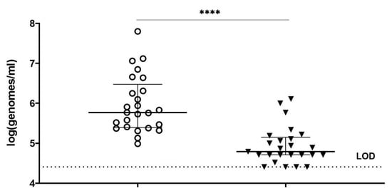 Reduction of cells log(genomes/mL) obtained with Gardnerella species-specific qPCRs for vaginal samples from women with BV, untreated (only MES buffer, transparent circles) and treated with 100 µg/mL PM-477 (black triangles) overnight. ****: p-value < 0.0001, as assessed by Wilcoxon test. LOD—limit of detection.